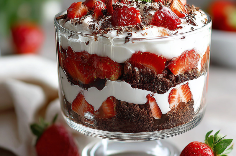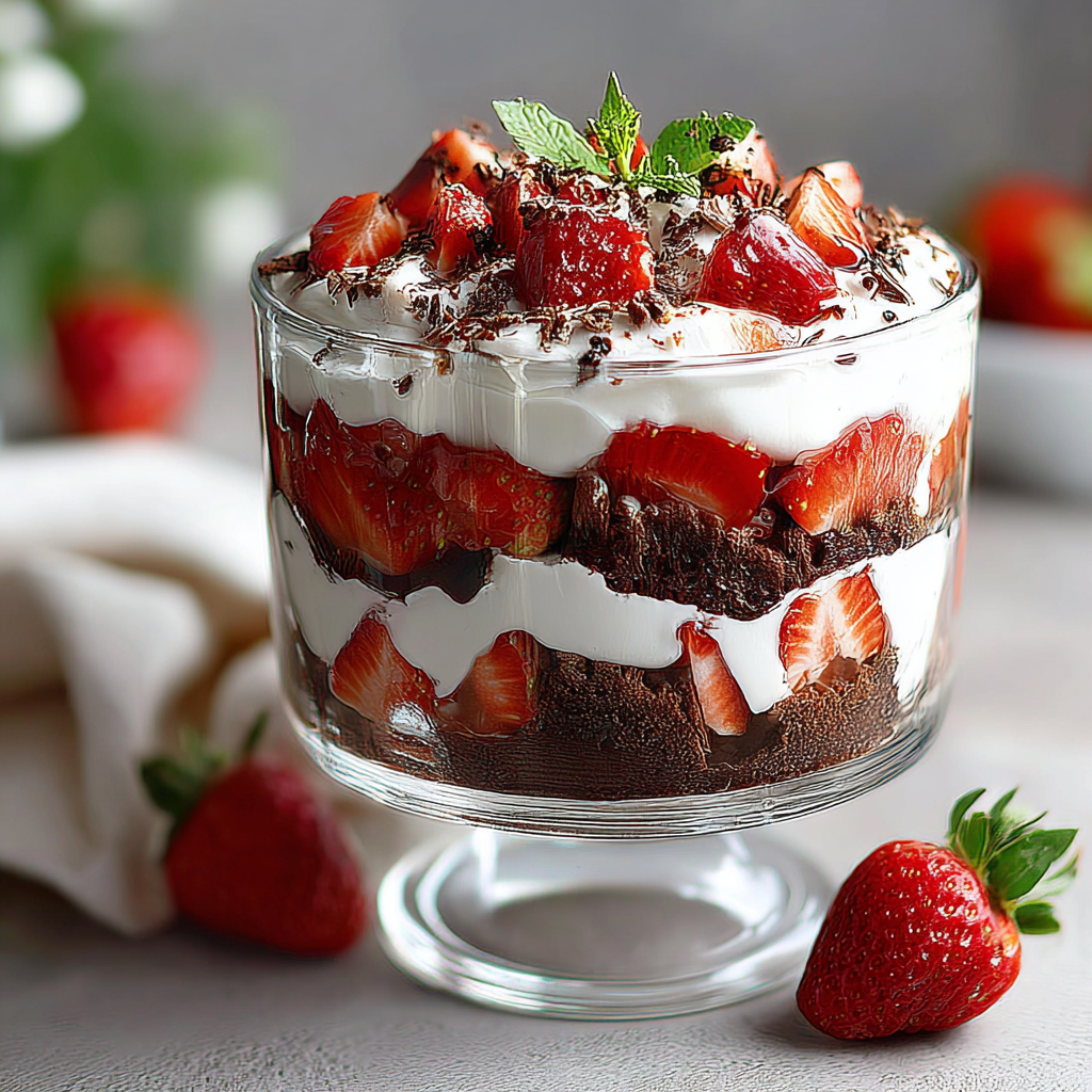 The beauty of this trifle lies not only in its taste but also in its presentation. The contrasting colors of dark chocolate and vibrant red strawberries make it an eye-catching centerpiece for any gathering. It’s a dessert that feels indulgent yet is surprisingly easy to prepare, making it perfect for both casual family dinners and special occasions.